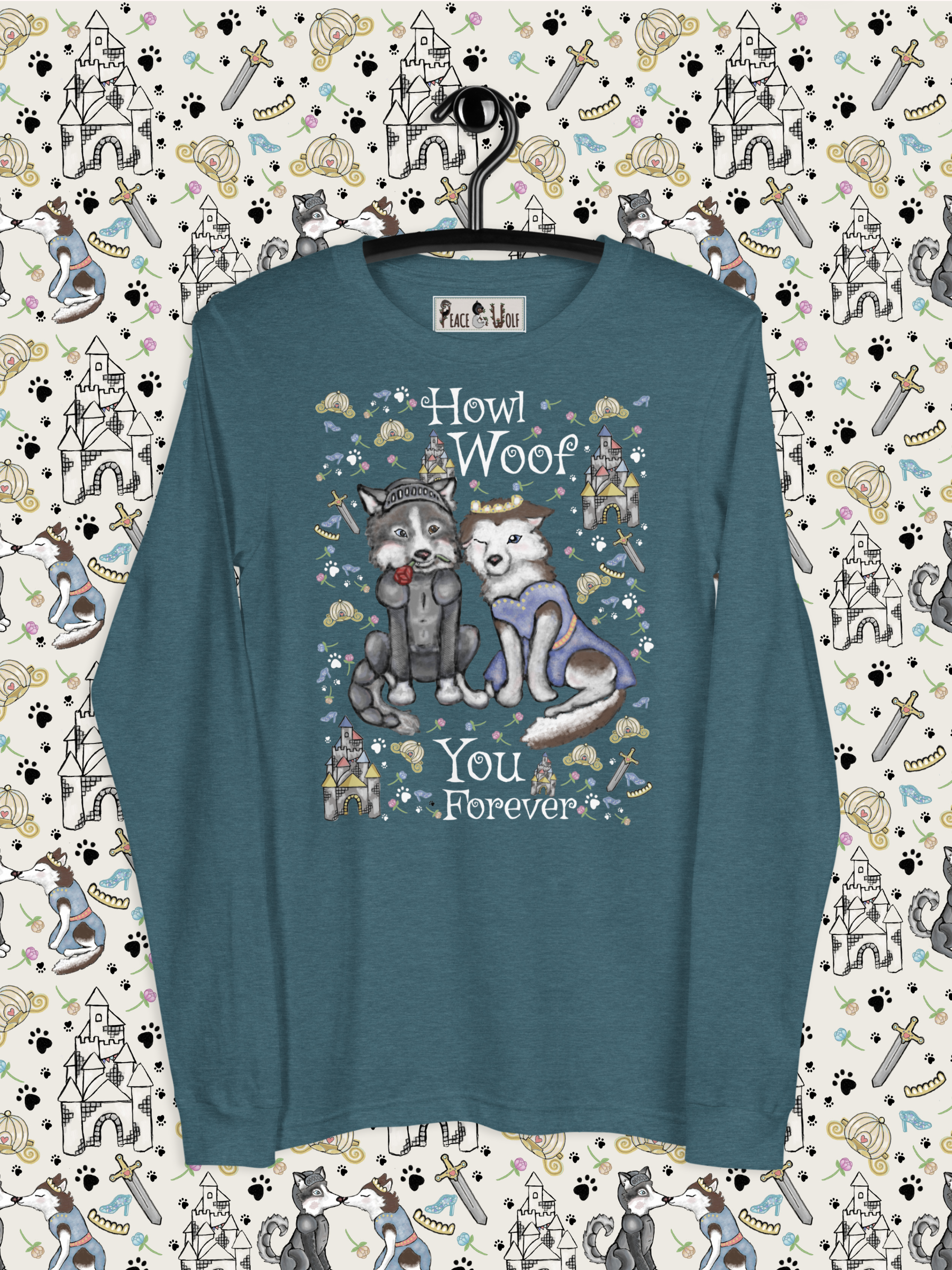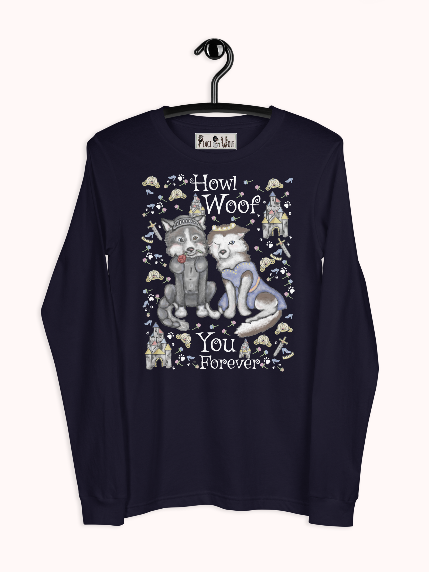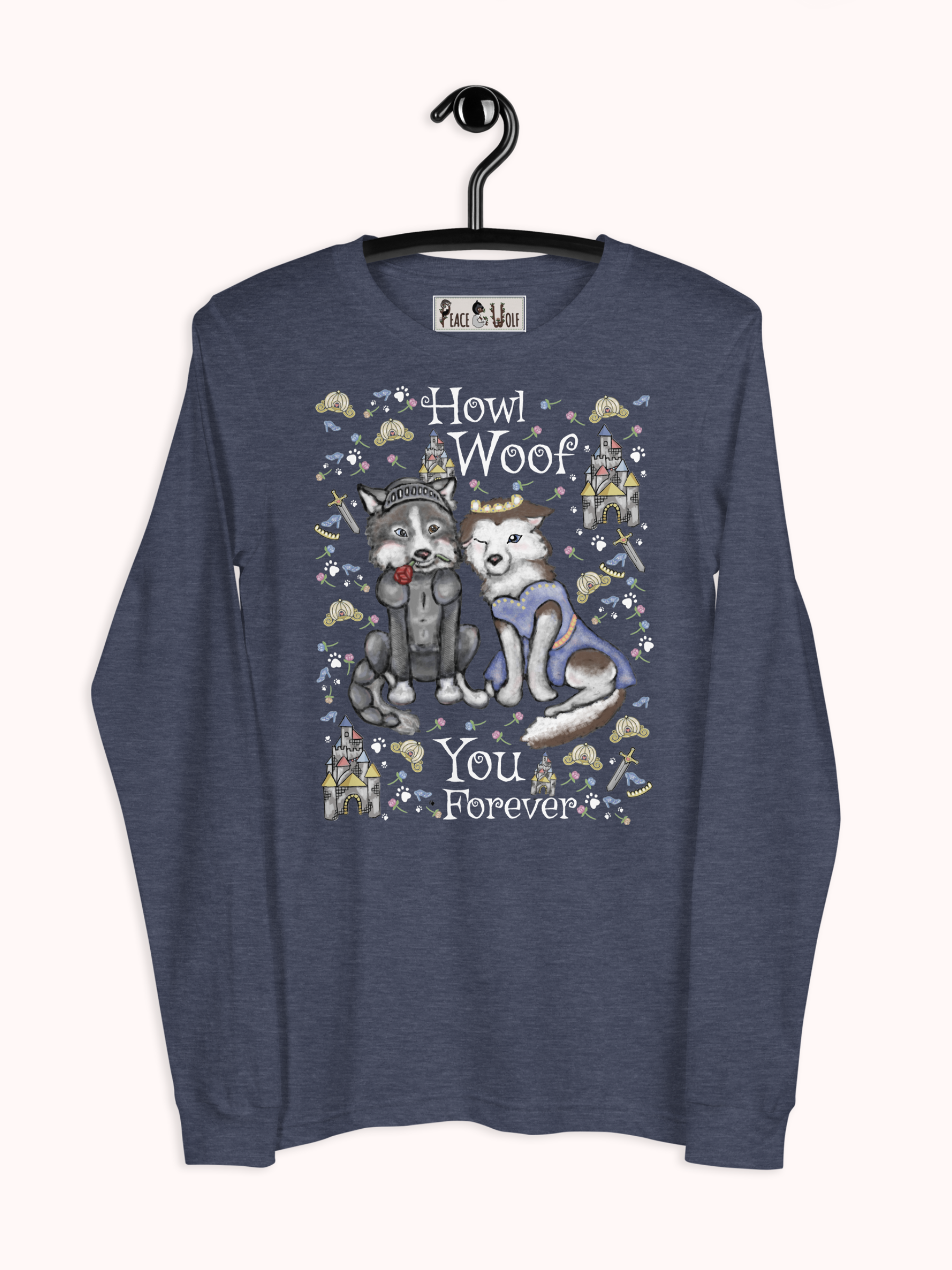 Two northern breed dogs sit close in this romantic and sweet fairy tale design that features a background of colorful fantasy castles, horse carriages, ballroom slippers, roses, valiant swords, and paw prints. One dog wears a knight suit of armor with a red rose in his mouth, his bi-colored eyes watching the rust-colored dog adoringly. The second dog, a beautiful dark red coated princess, wears a periwinkle dress and gold crown. In fanciful white text, the words, "Howl Woof You Forever," are written.