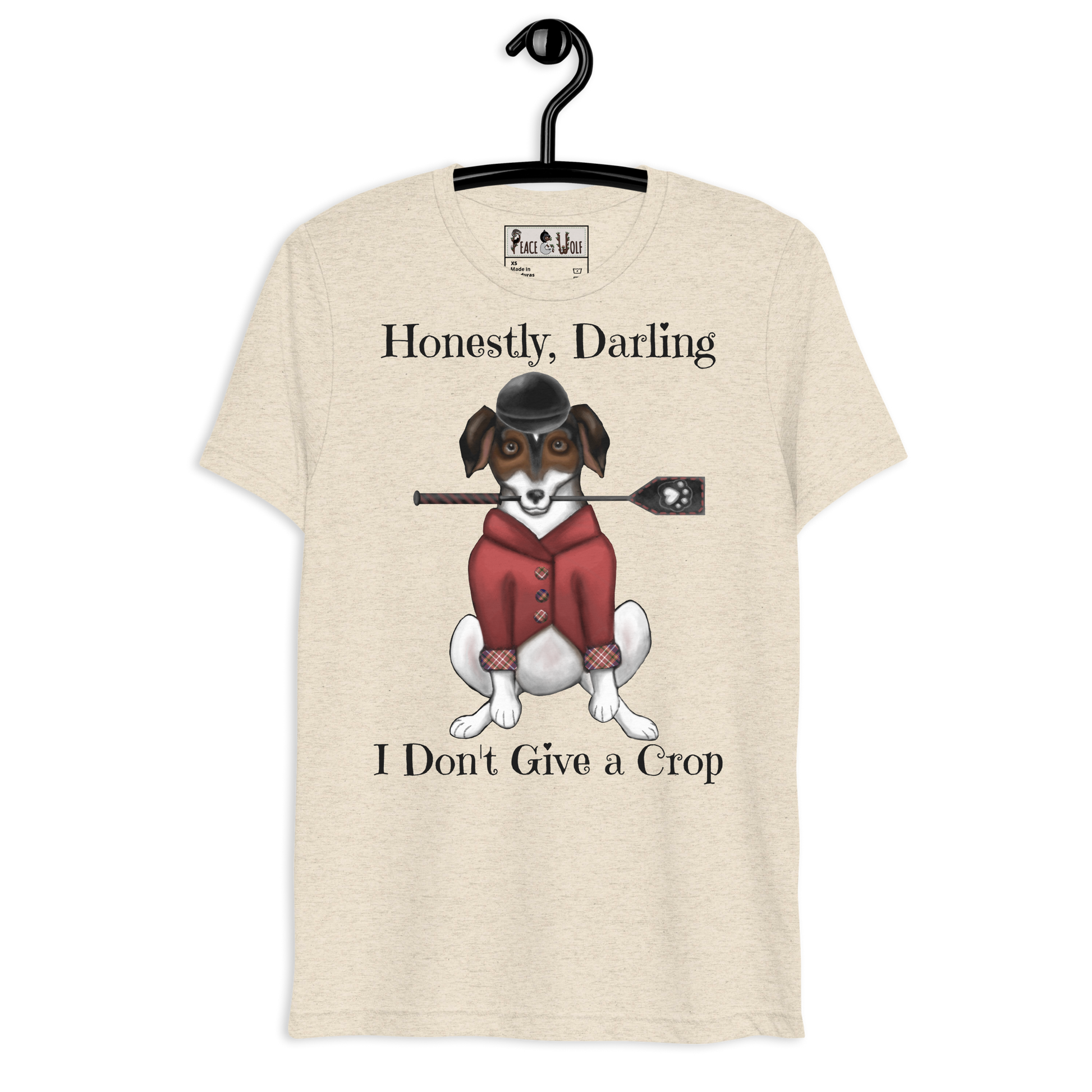 A perfect addition to any equestrian outfit, this design features a Jack Russell Terrier holding a paw print crop in its mouth. An English riding helmet and red coat accented with trendy plaid cuffs and buttons makes this Jack Russell Terrier look ready for horse shows. This unique artwork also shows the unique equestrian phrase directly from Peace & Wolf apparel "Honestly, Darling. I Don't Give a Crop."