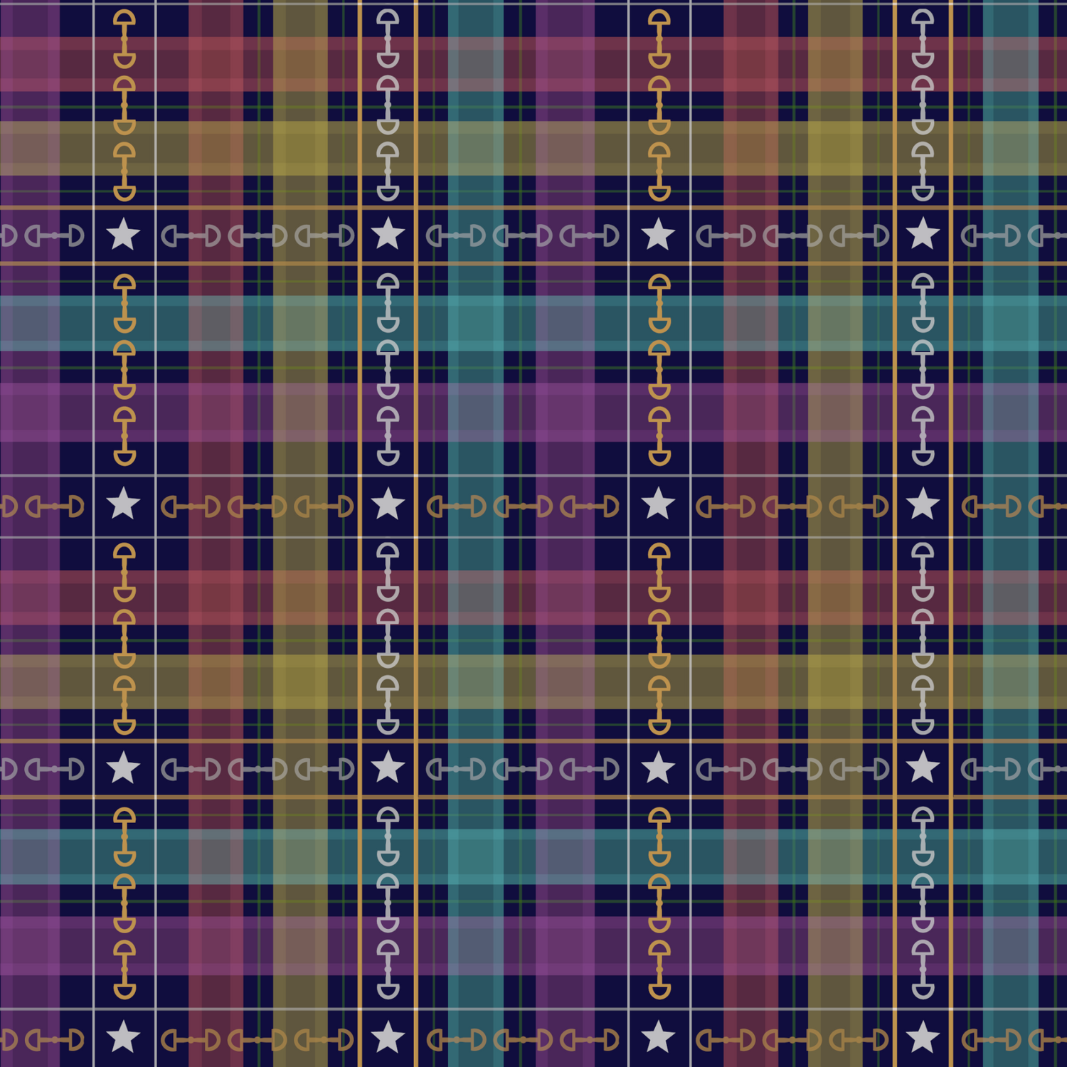 Bring a touch of whimsy to every outfit and unleash your inner unicorn with this colorful galaxy plaid, featuring rainbow hues of gold, yellow, teal, red, and purple on a rich navy background. White stars and gold and gray horse bits give it a celestial equestrian vibe. Whether you are a horse enthusiast or avid horseback rider, this plaid is perfect for those who believe in wishes and dream of unicorn magic.